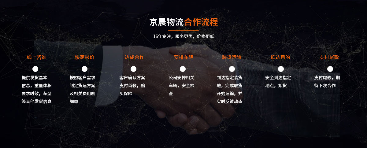 京晨物流内贸整车业务适合全国各城市地区,能延伸到各大城市交通枢纽周边的分支线小城市做到门对门的服务,具有各类车型4.2-17.5敞车,厢车,高栏车,全封闭车,高地板等,可承接长途搬家,大型设备大件运输业等业务,我们的优势是不仅有覆盖全国的分公司、加盟商、供应商网络地域优势,而且有绝对优势的专线专运,绝对优惠的价格和绝对全方位的客户服务。